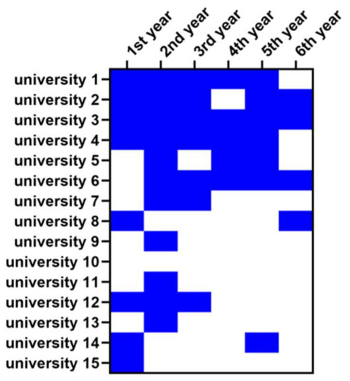 Some universities offered classes under the same name (suggesting continuity of the teaching program) during each semester of study, whereas others implemented a class only once during the course of the medical program. Table 1 summarizes the information about specific classes. The names of the universities were replaced with random numbers.