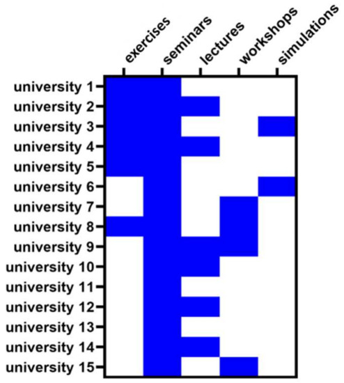 The courses were offered in the following formats: exercises, seminars, lectures, workshops, and simulations. Seminars were the most popular form of teaching and were offered by all medical schools (Figure 4), followed by lectures and exercises (used by six medical schools), workshops (used by four medical schools), and simulations (used by two medical schools).