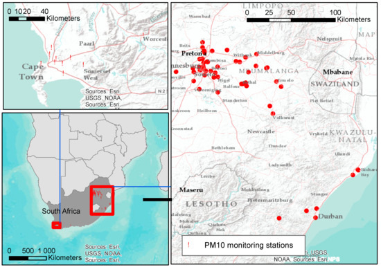 The levels of air pollution in sub-Saharan Africa (SSA) have remained high compared to other regions of the world that have witnessed notable improvements [1]. The deteriorating trend of air quality in SSA countries, such as South Africa, has been linked to rapid urbanization, industrialization and the resultant increase in population. South Africa relies significantly on fossil fuel for both industrial and domestic activities—over 80% of power generation is from fossil fuel. Other important sources of air pollution emission in South Africa include bush burning, land-fills, dust from construction sites and wind-blown dust from open land [2,3]. Exposure to ambient air pollution accounted for over four million deaths globally in 2019 [4]. Particulate matter less than or equal to 10 μm in aerodynamic diameter (PM10 µg/m3) is one of the most important pollutants of public health interest that is monitored in South Africa [5]. The revised 2015 National Air Quality standard of daily limit of 75 µg/m3 and annual limit of 40 µg/m3 are less stringent than the World’s Health Organization’s limit of 45 µg/m3 and annual limit of 15 µg/m3 [6,7].