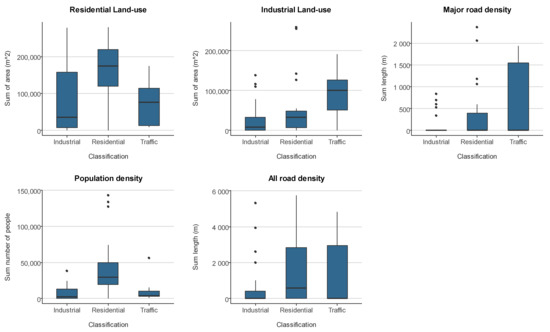 Distribution of indicators of PM10 emissions; land use (sum of area, m2), road density (sum length, m) and population (sum number of people) within a 300 m buffer across the three site classifications.