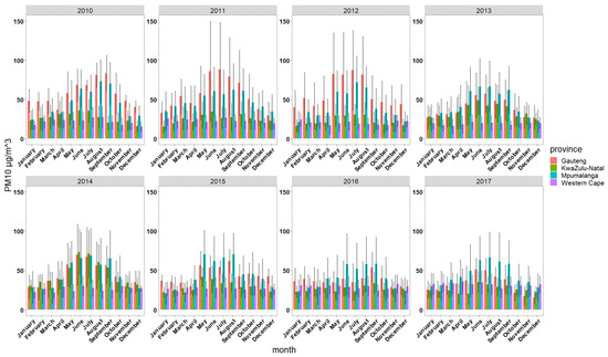 Variations in mean PM10 µg/m3 concentration across the provinces and months of the year. Error bars represent one standard deviation of the mean.