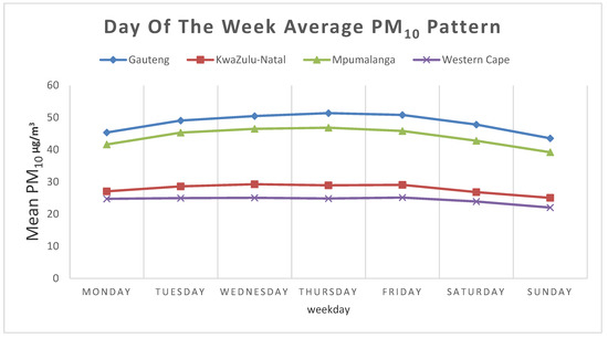 The trend in weekday PM10 level follows a similar pattern across the four provinces. PM10 concentration increased through the weekdays, reaching its peak between Wednesday and Friday. This study suggests that there is a difference between PM10 levels between weekends and weekdays, with lower PM10 levels reported during the weekends. Although there are only four traffic sites in this analysis, the decreased level in traffic-related activities during the weekend might be responsible for the observed lower PM10 levels during the weekend.