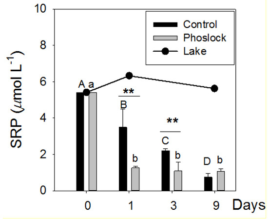 Changes of soluble reactive phosphorus (SRP ± standard error) after Phoslock® treatment. Data collected from lake water (n = 1) and from closed-bottom mesocosms for the controls (n = 3) and the Phoslock treatments (n = 3). Capital letters and lowercase present the differences over time in the control and Phoslock-treated mesocosms (p < 0.05), respectively. ** The differences between treatments at the same sampling time (p < 0.01).