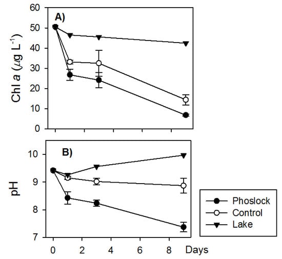 Changes in Chlorophyll a (A) and pH (B) over time in the lake water and the Phoslock®-treated and untreated mesocosms. Data were collected from the lake water (n = 1) and from the closed-bottom mesocosms for the controls (n = 3) and Phoslock® treatments (n = 3) from 2 July to 11 July. Error bars indicate standard errors.