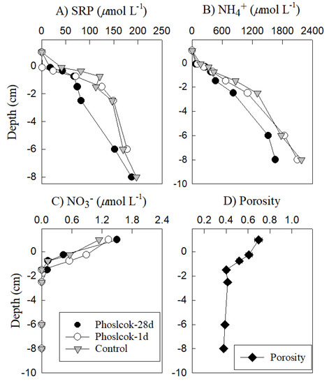 Although the pore water NH4+ (Figure 4B) increased gradually with the depth in all the sediment cores, the sediment capped by Phoslock® for 28 days exhibited the lowest concentration gradients down to 3 cm deep, with the concentrations remaining lower than the control and 1-d Phoslock® treatment. The concentrations of NO3− (Figure 4C) within all the sediment cores showed a sharp decrease from ~1.2 µmol L−1 in the overlying water to nearly undetectable at ~1 cm deep in the sediment, indicating a downward flux from the overlying water into the sediment. The porosity (Figure 4D) decreased from 0.7 to 0.4 from the sediment surface to ~2 cm deep.