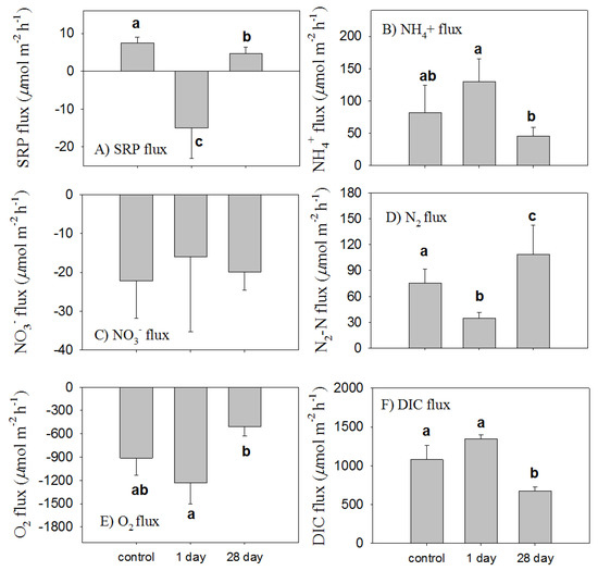 Flux rates at the sediment–water interface in Phoslock®-free and 1 day and 28 days after Phoslock® treatment. Flux rates include inorganic nutrient flux (A–C), denitrification (D), sediment oxygen consumption (E), and respiration rates (F). Symbols a, b, and c present the differences between means at a significance level of p < 0.05.
