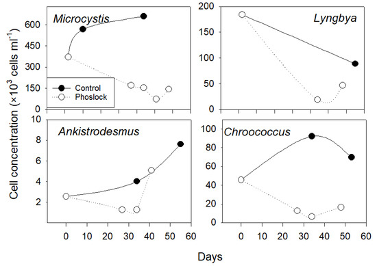 The Phoslock® treatment and the lower P availability were accompanied by a lower cyanobacteria abundance and altered speciation (Figure 7). In the treated water, the total cell numbers declined from the initial abundance of 6.1 × 106 cell mL−1 to 1.3 × 105 cell mL−1 in late August (50 days after sediment treatment). During this time, the abundance of N2-fixing cyanobacteria (mainly Pseudanabaena sp., Lyngbya sp., and Chroococcus sp.) decreased from 220 × 106 cell mL−1 to 6.6 × 104 cell mL−1. The abundance of Microcystis spp., the dominant non-N2-fixing species, was 2.8 × 103 cell mL−1. These abundances were 23.5% and 6.2% of the numbers observed in the control water: 2.8 × 105 cells mL−1 and 4.5 × 105 cells mL−1 for the N2 fixers and non-N2-fixing cyanobacteria (e.g., Microcystis spp.), respectively.