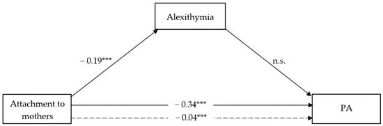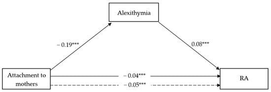 3.2.1. The Mediating Role of Alexithymia in the Association between Attachment to Mothers and RA vs. PA