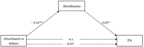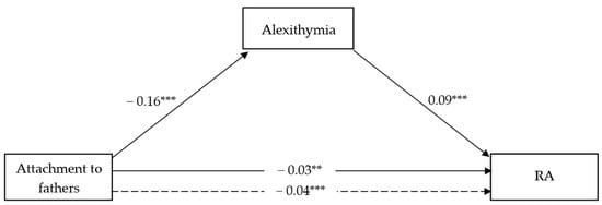 3.2.2. The Mediating Role of Alexithymia in the Association between Attachment to Fathers and RA vs. PA