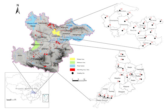 In central China, the city of Daye is located in the southeast of Hubei province. Sixteen villages in Daye were selected as the study areas, nine of which are mine-affected (polluted) areas in the northeast of Daye, while seven are relatively far from the mining (reference) area in the west of Daye. There are 32 random sampling sites distributed in the farmland of the selected villages, with two sampling sites per village. In the polluted areas, there were 18 sampling sites in 9 villages: Weiwang (WW, sampling sites 1 and 2), Jinqiao (JQ, sampling sites 3 and 4), Wangjiazhuang (WJZ, sampling sites 5 and 6), Luoqiao (LQ, sampling sites 7 and 8), Huajing (HJ, sampling sites 9 and 10), Chunguang (CG, sampling sites 11 and 12), Changle (CL, sampling sites 13 and 14), Guantang (GT, sampling sites 15 and 16), and Tuannao (TN, sampling sites 17 and 18). In the reference area, there were 14 sampling sites in 7 villages: Shangwang (SW, sampling sites 19 and 20), Zhushan (ZS, sampling sites 21 and 22), Mingshan (MS, sampling sites 23 and 24), Fandao (FD, sampling sites 25 and 26), Wuduan (WD, sampling sites 27 and 28), Yangqiao (YQ, sampling sites 29 and 30), and Shangzhuang (SZ, sampling sites 31 and 32). Villages in these two study areas were selected considering the inhabitants’ settlement and distribution. All geographical locations of the sampling points in the polluted and reference areas are shown in Figure 1.