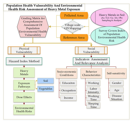 Integrated population environmental health vulnerability is divided into two aspects, physical and social vulnerability. We examined how to evaluate the above-mentioned vulnerability. Hence, an analytical framework considering population environmental health vulnerability assessment on heavy-metal exposure was designed, as shown in Figure 2. Oral intake and soil exposure are two specific pathways to conduct this research. Moreover, a preliminary investigation found that the majority of local residents eat vegetables growing in local soil, which may have been affected by heavy-metal exposure, and they mainly grow them for self-consumption. Therefore, what is more important is that contaminated soil and vegetable intake are correlated.