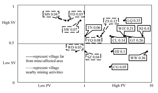 Figure 4 shows that the evaluated villages were classified into four categories by the hierarchical evaluation matrix: WD had low physical vulnerability and low social vulnerability; MS, SW, and FD had low physical vulnerability and high social vulnerability; SZ, CG, HJ, and WW had high physical vulnerability and low social vulnerability; YQ, TN, ZS, and FD had high physical vulnerability and low social vulnerability. Five villages near mining activities (JQ, LQ, GT, WJZ, CL, and TN) and two villages (ZS and YQ) far from the mining-affected area have high physical vulnerability and high social vulnerability, which are the urgent areas in environmental health risk management.