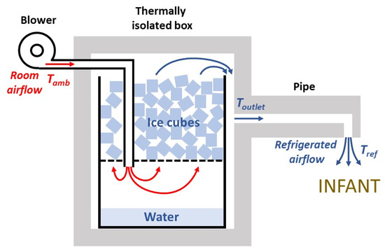 Generator of refrigerated air. A container has two compartments separated by a hollowed surface: ice cubes are placed in the top compartment and water resulting from ice thawing drops to the bottom compartment. The container is enclosed in a box made with thermally isolating walls. A room airflow at ambient temperature Tamb is generated by a blower, enters the lower compartment, and is refrigerated as it passes through the ice cubes. The cooled air leaves the chamber at temperature Toutlet and enters a thermally isolated pipe conducting the airflow to the infant. Given heat dissipation through the pipe wall, the airflow circulating through the pipe is heated to Tref, which is the temperature of the refrigerated air leaving the device and directed onto the infant. Accordingly, the airflow first experiences a cooling process (see Section 2.1.1) as it passes through the ice cubes and a subsequent heating process inside the pipe (see Section 2.1.2).
