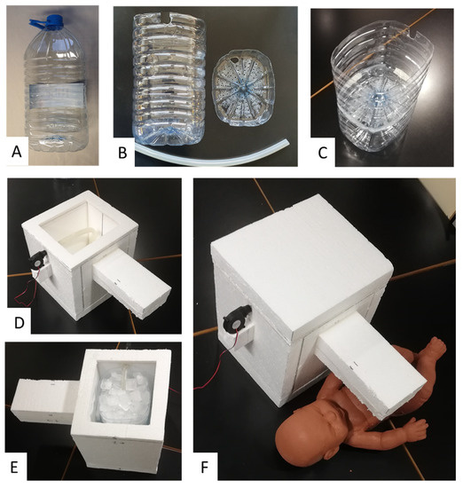 Construction of the simple, low-cost assembly used for the proof-of-concept testing. (A) Eight-liter plastic bottle of drinking water. (B) Compartment for ice/water made from the lower part of one bottle, piece to separate the ice and water made by cutting and drilling the base of another bottle, and piece of hose. (C) Assembled ice/water compartment. (D) Isolating chamber (expanded polystyrene) with blower and hose (upper wall open). Glue was used to seal the wall attachments to avoid air leaks. (E) Compartment for ice/water placed within the insulating chamber and loaded with ice. (F) Setting with closed chamber ready to be used with the testing infant manikin.
