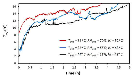 Figure 3 shows the time course of the airflow temperature measured at the pipe orifice (Tref) for the different thermally stressing conditions tested. For the sake of clarity, only data for Tref lower than 17 °C are depicted, showing the production of a refrigerated airflow 20 °C below normal body temperature (37 °C), which is most relevant in terms of helping the infant to maintain normothermia. The small fluctuations observed in each Tref recording were caused by spontaneous ice cube rearrangements as thawing proceeded. However, repeated measurements showed that variations in the time at which Tref achieved the 17 °C value only varied within a 10 min range (data not shown). As expected, Tref progressively increased, being <17 °C for 5 h in the example of hot dry desert condition (HI = 42 °C), for 4.5 h in the hot humid example of tropical ambient conditions (HI = 43 °C), and for 3.75 h in the condition of exceptional stress corresponding to HI = 52 °C. Interestingly, the capability of the device to refrigerate the airflow was not limited to the times shown in Figure 3 because, in all cases, at the end of the recording there was still ice remaining within the container. Remarkably, the similar values of airflow temperatures (Tref) in Figure 3 (at any time all measurements differ by less than ≈5 °C) show that the capacity of the setting for decreasing the airflow temperature scarcely depends on the ambient air conditions (Tamb, RHamb), although the duration of refrigeration (e.g., for Tref < 17 °C) considerably decreases with RHamb due to the energy required for air condensation (as predicted by the theoretical model equations).