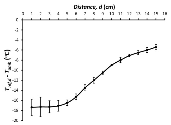 Reduction in the airflow temperature at different distances from the device outlet. The difference between the temperatures of the refrigerated air at a given distance (d) (Tref,d) and the ambient temperature (Tamb) decreased as the distance d from the device outlet increased. Data are mean ± standard deviation of three repeated measurements.