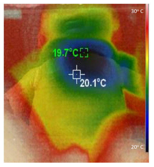 Figure 5 illustrates with an example how the refrigerated air is distributed on the body of the infant. This specific thermal image was taken when the airflow temperature Tref was 24 °C below Tamb, and the thoracic surface of the manikin was 8 cm below the airflow outlet. It is important to mention that measuring the temperature at the manikin surface simply serves to illustrate how the refrigerated airflow is distributed on the manikin, which has a geometry that realistically mimics that of an infant. The specific values of temperatures in Figure 5 do not represent those that would be found on the skin of an infant because the energetically passive manikin does not dissipate metabolic heat or regulate its temperature.