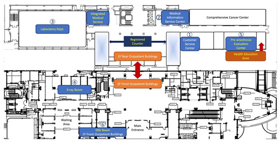 To improve the service provided by the Medical Service Center, the physical space required for examination and testing during the hospital admission process was integrated into the second floor of the Rear Outpatient Building, using this adjustment to optimize the inpatient process and deliver a one-stop hospital admission service. The floor plan for the hospital admission procedure following this renovation is shown in Figure 3.