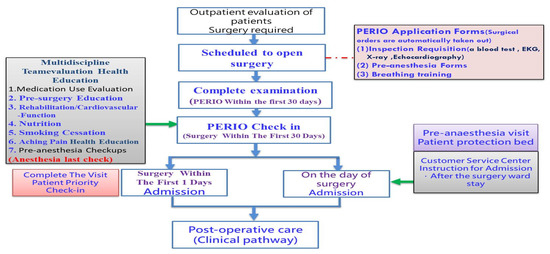 The present study established a perioperative assessment process (hereafter referred to as the PERIO process, as shown in Figure 4) in order to improve the hospital admission process. The subjects involved were patients scheduled to undergo routine surgery in the orthopedics, urology, colorectal surgery, and otolaryngology departments. The patients completed all tests and examinations, pre-surgery education, drug consultations, and pre-anesthesia checkups the day prior to hospital admission and surgery.