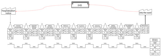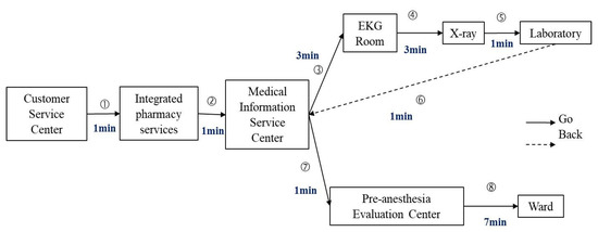 According to the actual walking route map and spatial positions of the units that patients came into contact with during the hospital admission procedure, the testing and examination units (such as the testing facilities, X-ray examination facilities, and ECG examination facilities), as well as the Pre-anesthesia Evaluation Center, were located on different floors within three buildings. This meant that patients dedicated a lot of time walking between units. Moreover, because the units were spread out, flow for the hospital admission process was poor, requiring patients to frequently return to the Medical Information Service Center in order to ensure that they would reach the next correct unit.