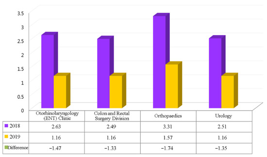As shown in Figure 7, the average length of hospital stays in 2019 was lower for both the departments and the surgical procedures that had introduced PERIO than it was for the same departments and surgical procedures in 2018. The difference was in the range of 1.33–1.74 days. Based on the number of cases (304 patients) using PERIO, the aggregate length of hospital stays was reduced by 472 days in 2019.