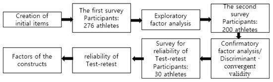 In this study, a scale was developed to quantify the efforts and rewards of athletes using the following process: First, the concept and structure of the efforts and rewards of athletes were identified, and the factors were specified. The content was created based on an empirical search of the efforts and rewards presented in a previous study [27]. In a study by Park et al. [27], which confirmed the concept of athlete efforts and rewards, athletes’ efforts were explored in terms of skill enhancement, self-management, cognitive psychological reinforcement, and interaction, and athletes’ rewards were extracted in terms of benefits, social support, positive outcomes, and future stability. Based on the content, and through meetings with the group of experts, as many initial items as possible were developed to interrogate the athletes regarding the attributes of efforts and rewards. All the items were then reevaluated by a process of correcting, supplementing, and deleting ambiguous or semantically redundant questions (efforts: 49 items, rewards: 38 items).
