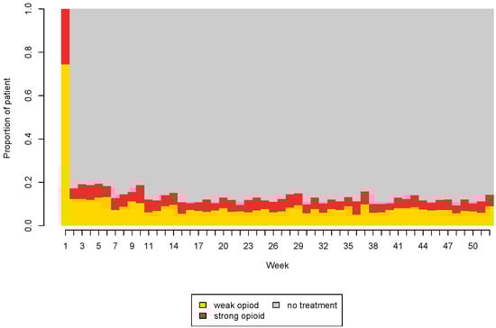 Based on our selection criteria, 469 new users of opioids for the treatment of chronic non-cancer pain were identified and included in the analysis. Their characteristics are summarized in Table 2. The majority of these patients were women (71%), with a mean age of 72 years. In general, weak opioids were used more than strong ones. During the first year, 79% of subjects received weak opioid prescriptions vs. 50% receiving strong opioids. Notably, a substantial proportion of subjects (29%) received both. Women tended to use both weak and strong opioids more than men. However, use of opioids was generally low during the first year (on average, about 9 weeks of use of any type of opioids in both sexes) (Table 2). This suggests that most of the subjects had intermittent therapy during the first period of treatment. The state distribution plot, reported in Figure 1, shows changes in the proportion of patients treated with weak and strong opioids during the first year of treatment. Almost 80% of subjects started with weak opioids, but the “pause” state soon became the dominant one (because of the intermittent regimen). Moreover, since the first weeks, the number of users of weak and strong opioids became much more similar and remained constant over time. This suggests that many subjects had an early escalation from weak to strong opioids.