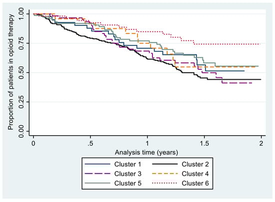 The results of the cluster analysis were used to predict the future discontinuation of opioid therapy in the cohort. Figure 3 shows that the probability of treatment discontinuation was different among the clusters (p < 0.001). These results were confirmed in the Cox analysis reported in Table 4. Compared to cluster 2 (the reference group), subjects belonging to cluster 6 had a 63% lower probability of stopping opioid treatment (adjusted hazard ratio 0.36; 95% confidence interval: 0.20 to 0.65). The other clusters displayed an intermediate behavior, with their curves falling between those of cluster 2 and 6.