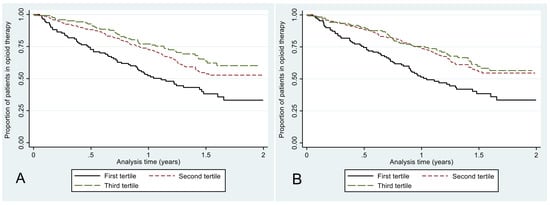 Time to discontinuation of the opioid therapy according to different tertiles of entropy (A) and turbulence (B).