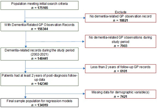 - Watson, J.; Giebel, C.; Green, M.; Darlington-Pollock, F.; Akpan, A. Use of routine and cohort data globally in exploring dementia care pathways and inequalities: A systematic review. Int. J. Geriatr. Psychiatry 2021, 36, 252–270. [Google Scholar] [CrossRef]