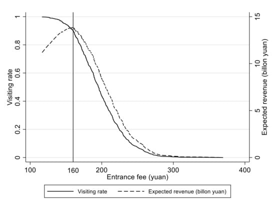 The visitor’s demand curve can be reflected by aggregating each respondent’s WTP, i.e., the weighted sum of predictors at the individual level. Figure 2 shows the demand curve, which is close to being a reflection of the S-shape in the y-coordinate. As expected, the demand curve slopes downwards, indicating that the visiting rate will decrease with increased entrance fees. The total number of visitors to the QNP is expected to be 96 million after the establishment in 2025 [40]. Based on our estimation, the expected ticket revenue (i.e., the product of ticket price, expected number of visitors, and visiting rate) curve has been realized and is presented in Figure 2. The demand curve becomes inelastic when the entrance fee is about 160 yuan. Meanwhile, the expected ticket revenue would reach its maximum of 13.8 billion yuan given the entrance fee of 160 yuan.