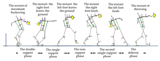 In this study, discus throwing was divided into five phases: (1) double-support phase: from the instant of maximum backswing, which is defined as the instant of maximum shoulder–hip separation angle, to the instant the right foot leaves the ground; (2) initial single-support phase: from the instant the right foot leaves the ground to the instant the left foot leaves the ground; (3) non-support phase: from the instant the left foot leaves the ground to the instant the right foot lands; (4) second single-support phase: from the instant the right foot lands to the instant the left foot lands; and (5) delivery phase: from the instant the left foot lands to the instant the discus releases from the participant’s hand (Figure 2) [5]. The percentages of the durations of the five phases were calculated as the ratio of each phase’s duration to total throwing time (i.e., from the instant of maximum backswing to the instant the discus releases from the participant’s hand).