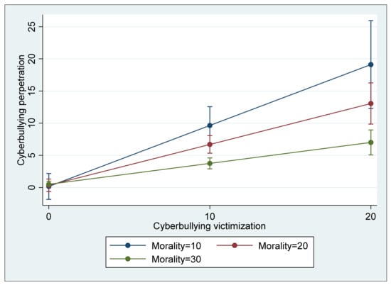 Interaction between cyberbullying victimization and morality predicting cyberbullying perpetration (with 95% confidence intervals).