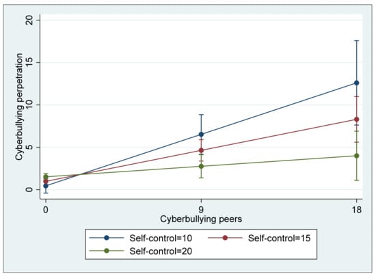 Interaction between association with cyberbullying peers and self-control predicting cyberbullying perpetration (with 95% confidence intervals).