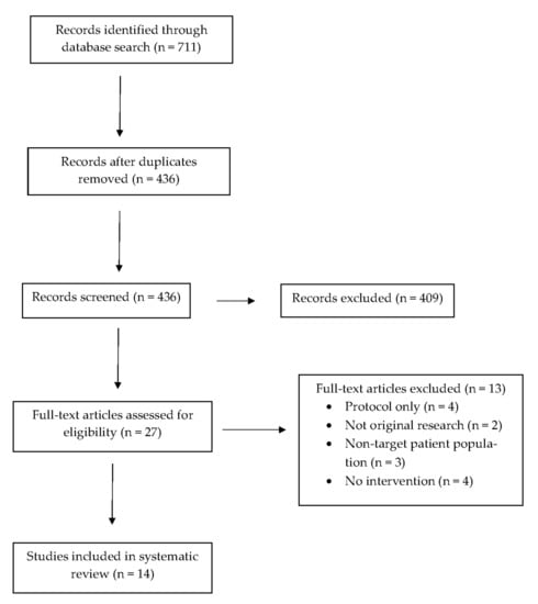 A cumulative total of 711 records were identified across the databases reviewed from the past 36 years, 275 of these records were duplicates and ultimately excluded. Among the remaining 436 records, 409 of them were subsequently excluded for one or more of the following reasons: (1) were not full-text articles; (2) involved a different target population than caregivers of children; (3) implemented in ambulatory (e.g., primary and subspecialty care clinics, emergency department) or other outpatient and community settings; and (4) did not assess tobacco reduction or cessation outcomes, 27 full-text articles were assessed for inclusion in this narrative review. Among them, 13 were ultimately further excluded for the following reasons: (1) presented only a study protocol; (2) did not involve conducting research to assess for tobacco reduction or cessation outcomes; (3) there was no intervention implemented in the study; (4) the target population comprised a combination of both inpatients and outpatients; and (5) study locations included both inpatient and outpatient settings. Fourteen articles ultimately met the criteria for an inpatient tobacco cessation program for caregivers of pediatric patients as elucidated in Figure 1 [,,,,,,,,,,,,,]. IRB approval or an equivalent based on the country was obtained across eleven studies that involved both quality improvement and research [,,,,,,,,,,]. A comprehensive breakdown of each study’s participant characteristics, intervention components, and tobacco reduction and cessation outcomes can be found in Table 1.