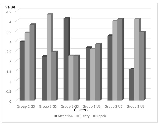 In regard to unidentified students (Figure 3), the first group (Cluster 1) mostly scored medium-low on all of the EI dimensions. This group included 19.6% of the unidentified students. The second group (Cluster 2) contained 73% of unidentified students who had high clarity and repair with medium attention. The third group (Cluster 3) was characterized by low attention with high clarity and medium repair. Only 7.4% of unidentified students were in this group.
