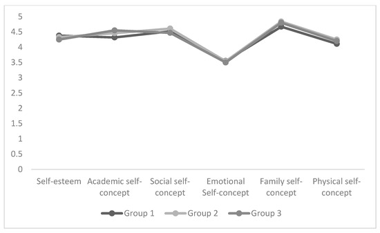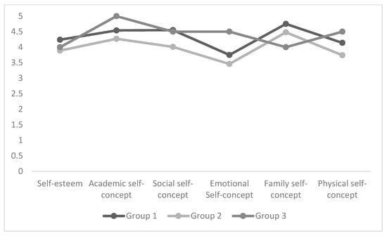 To test whether the emotional profile was significantly different in self-esteem and self-concept, we conducted an analysis of variance ANOVA with Tukey post-hoc analyses. Each student was assigned to a cluster and then we compared their self-esteem and self-concept scores. Results revealed that there were no significant differences between the three emotional intelligence groups with either self-esteem or self-concept in unidentified students (Figure 4). However, we observed significant differences in the three profiles of gifted students in self-esteem (F(2115) = 2.95; p = 0.05), social self-concept (F(2115) = 3.90; p = 0.02), and physical self-concept (F(2115) = 3.50; p = 0.03). These results indicated that there were statistical differences in the levels of self-esteem and some dimensions of self-concept among the different emotional profiles. Figure 5 shows the differences between emotional intelligence profiles in regard to self-esteem and self-concept. Students in group 1 had higher scores in self-esteem (MG1 = 4.24; and MG2 = 3.89; MG3 = 4), and social (MG1 = 4.55; MG3 = 4.5; and MG2 = 4) and physical self-concept (MG3 = 4.50; MG1 = 4.14; MG2 = 3.74). The findings partially confirm H4. We did not find differences in self-esteem and self-concept according to the emotional intelligence profile in unidentified children.