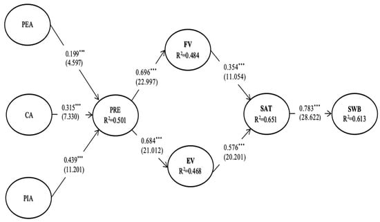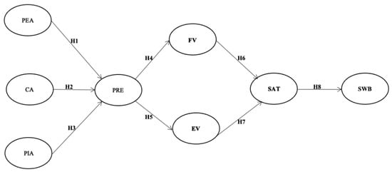 | Constructs | PEA | CA | PIA | PRE | FV | EV | SAT | SWB | Items | Standardized Factor Loading |