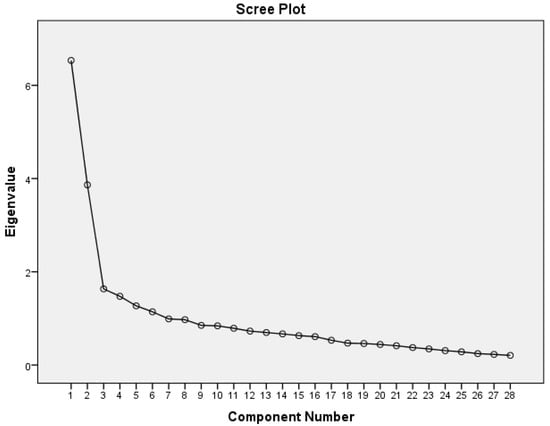 Factor analysis enables the determination of the underlying subdomains of a questionnaire [50]. Exploratory factor analysis (EFA) was recommended for establishing equivalence and factor structure validation of the translated and adapted questionnaires performed in different sample populations [51]. In this study, the MEQ factor structure was determined by using principal component analysis with varimax rotation [52]. This rotation produces a simpler solution and uncomplicated interpretation while maximizing the total variances of the squared loadings correlation between variables and factors. An eigenvalue of >1, a factor loading of ≥0.4 and a scree plot were applied for this study (Figure 1) [26].