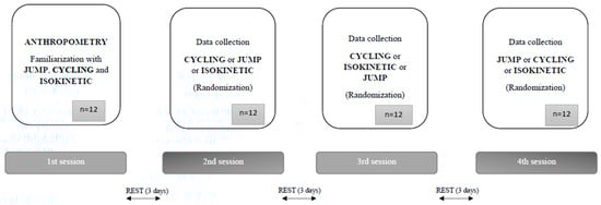 The experimental procedure used for both groups of participants was performed during the 4 sessions separated by at least three days of rest. The first test session consisted of anthropometric measurements, followed by a familiarization with JUMP, CYCLING and ISOKINETIC tests. In the second, third and fourth testing sessions, each test was performed separately. Note that the order of the tests was randomized for each participant. Moreover, the loads within each test were randomized. The sessions usually lasted about 90 min. For all tests except CYCLING, the first trial served as a practical test, while the second trial was used for further analysis. Prior to each session, each participant was given a 5-min warm-up period on a stationary bicycle, followed by 5 min of active and passive stretching exercises. Afterwards, participants had a specific warm-up consisting of several trials of jumping and isokinetic extension, but not cycling (because they already had it in the general warm-up). All measurements were performed in the university research laboratory. The process of data collection is shown in Figure 1.