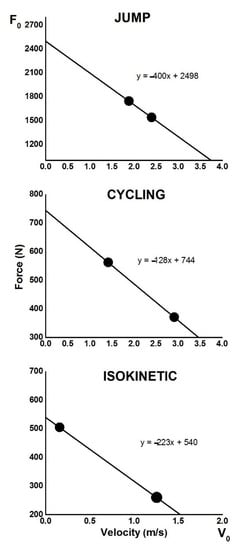 Although recent studies suggested that F-V relationships could be used in routine testing [,], only a few of them investigated the two-point model (i.e., the load). The results of the studies mentioned above showed that the parameters obtained from the two-point model were very similar to those obtained from the linear F-V relationship. Furthermore, the investigation of [] showed that reliability and validity were highest when the most distant pair of loads (i.e., 20% and 70% of 1 RM) was used among all two-point methods evaluated. Based on this fact, and in line with our previous study [], we have applied the specific magnitudes of load (described under Methods) in the present study. The results showed that the two-point parameters for JUMP, CYCLING and ISOKINETIC were higher than the directly measured variables force and power. Moreover, the correlation between them was strong, except for the correlation between the parameters F0 and Fmax in CYCLING, which was low and negligible. The possible reason for this result could be that a standard test procedure involving a load of 6 kg (corresponding to 8.9% of the body mass of the participants) was the optimal load for the development of maximum power [,] rather than the maximum force. Note that velocity variable was excluded as it could be considered constant in ISOKINETICS. It should be noted that the distance between the applied loads was the furthest in the ISOKINETIC compared to the other two tests (see Figure 1). This could explain the highest correlation between two-point parameters and directly measured variables of F (r = 0.99) and P (r = 0.98) in this test.