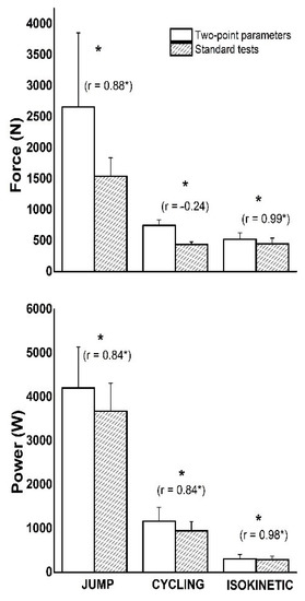 The averaged across the participant values of F (top panel), and P (bottom panel) obtained from the two-point model (open bars) and standard tests (filled bars) for all lower limb tests (means with SD error bars). The correlation coefficients are presented in parentheses above bars (* p < 0.05—significance of correlation). Significant differences between the two-point parameters and maximal values obtained from standard tests are marked (* p < 0.05).