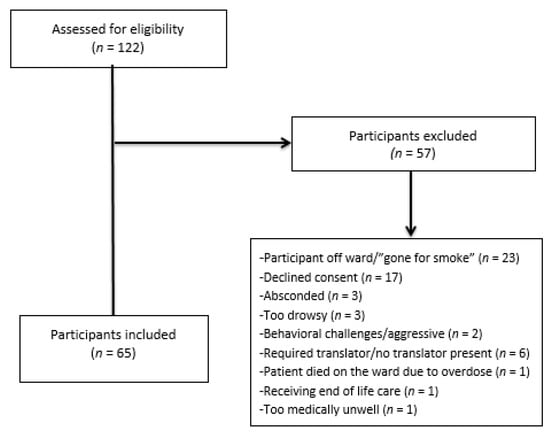 The flow of participants through the study is shown in Figure 1. Out of 122 patients assessed for eligibility, 57 were excluded for various reasons. The most prevalent reasons were that the patient was off the ward (n = 23) at the time or patient refusal (n = 17). In some cases, potential participants who were off the ward were recruited at a later time and thus included in the study numbers (n = 65). The results of the test battery are reported elsewhere (paper under review).