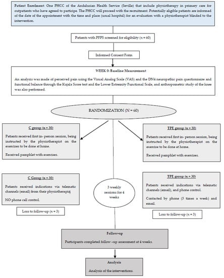 The convenience sampling method was used based on previous studies [17], an appropriate formula for the comparison of two proportions. The total number of patients who began the study was 60 (30 + 30), and only 6 patients (3 + 3) did not finish the study (due to dropping out or not answering the appointment or supervision calls). The final estimated sample size with a 10% dropout was equal to 27 individuals in each group (α = 0.05, β = 0.2). Eligible patients were randomly divided into two groups after providing written informed consent with the epidemiological data analysis program (EPIDAT) [18] program. All of them were Caucasian subjects. The first control group (C group) received indications via telematic channels from their physiotherapist following the Spanish Society of Rehabilitation and Physical Medicine (SERMEF) indications [17], whereas the second TPE group, as well as receiving the indications via telematic channels from their physiotherapist following SERMEF indications [19], also received telephone advice at least three times a week over the four-week period that was the object of the study.