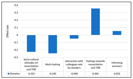Moderate effect size (0.356) was observed for the “feelings towards resuscitation and TOR” domain and the remaining domains yielded small effect sizes with their absolute numbers smaller than 0.3 (Figure 4). The overall PCT score at baseline and post-training did not show any statistically significant change: mean change = −0.58%, 95% CI (−2.73 to 1.53), p = 0.576 (Table 3). The PCT score in the feelings towards resuscitation and TOR domain increased by 4.77%, 95% CI (1.42 to 8.13), p = 0.006, while the PCT score in the multi-tasking domain decreased by 4.11%, 95% (−7.82 to −0.41), p = 0.030 (Table 3).
