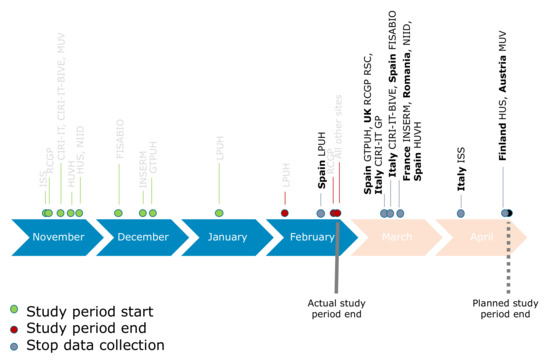 At the site level, the end of the study period was defined as either the week prior to the first of two consecutive weeks when no influenza viruses were detected, or the previously set end of the study period (30 April 2020), whichever occurred first. As illustrated in Figure 2 and described in Table 2, several sites stopped collecting data by the beginning of March. Moreover, the influenza season was shorter than expected due to the lockdown, social distancing and other COVID-19 protective measures; thus, no influenza-positive swabs were collected beyond week 12 of 2020. Therefore, the end of the study period for the main analysis was established as 29 February 2020 (two months earlier than the originally established date of 30 April 2020).