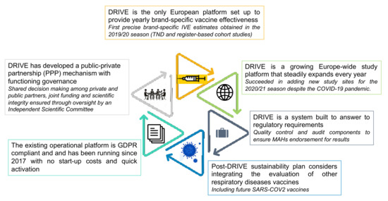 In the future, DRIVE proposes to leverage the COVID-19 experience during the 2019/2020 and 2020/2021 seasons to design its proposal for a post-DRIVE study platform for influenza and other potential respiratory diseases (e.g., COVID-19, respiratory syncytial virus (RSV)) by developing a proof of concept. This proof of concept will consider the feasibility of adapting the DRIVE influenza study platform for the evaluation of future COVID-19 vaccines and will propose a PPP model to create a common study platform to monitor the vaccine effectiveness of several respiratory infectious diseases.