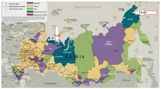 In full measure, the problem of a shortage of labor resources is relevant for the Nenets Autonomous Okrug (NAO) and Chukotka Autonomous Okrug (ChAO) (Figure 1), the populations of which are 44.1 and 50.7 thousand people, and the densities are 0.25 and 0.07 people/km2, respectively (as of 1 January 2020). In addition, with extreme climatic conditions, underdeveloped social and economic infrastructures are common to both regions. Their difference lies in the leading type of economic activity. In NAO, the economy is based on the extraction of oil and natural gas, whereas the extraction of hard and brown coal, alluvial and ore gold, and other nonferrous metal ores prevail in ChAO. Despite the noted difficulties in terms of the size of the gross regional product per capita in 2018, NAO ranked first (6288.5 thousand rubles) and ChAO ranked fifth (1.386.1 thousand rubles) in Russia [,].
