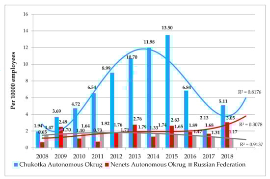 It is known that the climatic conditions of the Arctic modify the action of harmful occupational factors, increasing the risk and reducing the time of formation of occupational diseases [,,]. In 2008–2018, the level of occupational morbidity in the Arctic, in contrast to the Russian Federation as a whole, tended to increase [,]. Previous studies were mainly devoted to the problems of populous and economically more important regions of the Arctic: Murmansk oblast, Yamalo-Nenets Autonomous Okrug, and Krasnoyarsk Krai [,,]. At the same time, due attention was not paid to the NAO and ChAO, which have less access to the leading scientific and medical centers of the country. It is important to note that the early termination of labor activities due to occupational diseases is an additional factor that aggravates the shortage of labor resources in the northern regions [,].