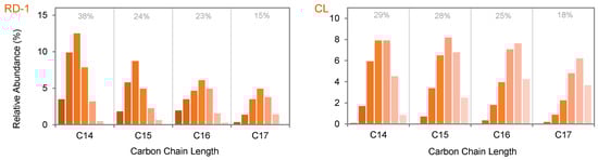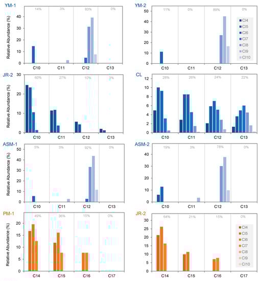 For MCCPs, C14 homologues were present in 18% of samples and C15, C16 and C17 groups were detected in 14%, 14% and 7% of samples, respectively. Among the samples in which MCCPs were detected, C14 homologues contributed an average of 56% ± 28% of ∑MCCP concentrations while C15, C16 and C17 groups accounted for 22% ± 13%, 16% ± 10% and 7% ± 9%, respectively. Hexachlorinated congener groups were the most prominent in the five samples containing MCCPs, with an average relative abundance of 31% ± 13%, closely followed by hepta- and penta-chlorinated groups, contributing 26% ± 5% and 21% ± 11%, respectively. Smaller proportions of Cl8, Cl9, Cl10 and Cl4 averaged 12% ± 12%, 6% ± 11%, 2% ± 5% and 2% ± 3%, respectively. In contrast to the findings for SCCPs, MCCP congener group patterns in consumer goods samples pool mat PM-1, jump rope JR-2 and rubber duck RD-1 were essentially similar to the distribution reported in CP-42 formulations from all three Chinese manufacturers [] (Figure 1). Comparable patterns were also observed in European rubber samples by Brandsma et al. [] who reported overall homologue patterns of C14 (44%), C15 (27%), C16 (17%) and C17 (12%) in tires, granules and playground tiles. The same order of carbon-chain length prevalence was, likewise, described by Wang et al. [] for both rubber and PVC materials, although C14 dominance was slightly more prominent. The more even pattern of carbon-chain length homologues in sample CL, however, could be indicative of combined application of two or more formulations, such as CP-42 with C14 > C15 > C16 > C17 distribution and CP-52 with the inverse C17 > C16 > C15 > C14 [], or recycled source materials.
